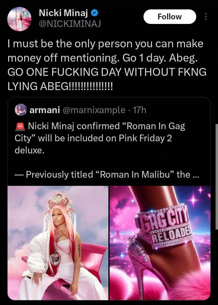 On the microblogging platform X, Nicki responded in Pidgin to a post about her that appeared to be false. In her tweet, she expressed frustration about how some people only make money by mentioning her name, asking them in Pidgin to go a day without talking about her.